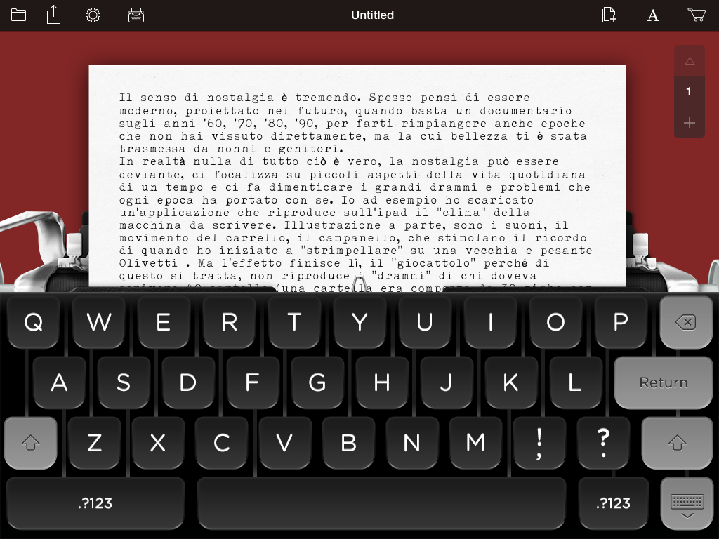 In realtà nulla di tutto ciò è vero, la nostalgia può essere deviante, ci focalizza su piccoli aspetti della vita quotidiana di un tempo e ci fa dimenticare i grandi drammi e problemi che ogni epoca ha portato con se. Io ad esempio ho scaricato un’applicazione che riproduce sull’ipad il “clima” della macchina da scrivere. Illustrazione a parte, sono i suoni, il movimento del carrello, il campanello, che stimolano il ricordo di quando ho iniziato a “strimpellare” su una vecchia e pesante Olivetti . Ma l’effetto finisce lì, il “giocattolo” perché di questo si tratta, non riproduce i “drammi” di chi doveva scrivere 40 cartelle (una cartella era composta da 30 righe per 60 battute ciascuna, ovvero 1800 battute, spazi compresi). Parlo del cambio del nastro, della correzione dei numerosi errori, da fare con bianchetto o con strisce dotate di bianchetto, da sovrapporre all’errore e su cui “ribattere”.